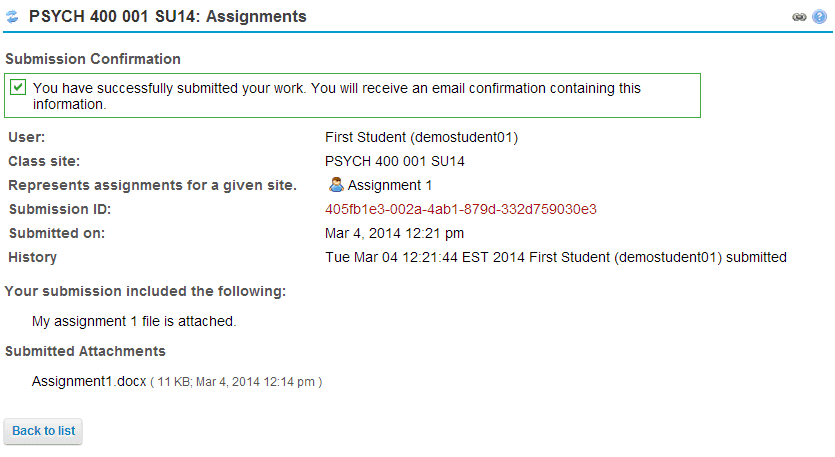 Once you have submitted your assignment, you will receive a confirmation message on screen. In addition, if you have opted to receive email notifications, you will also receive an email confirmation of your submission.