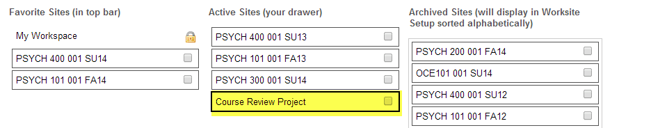 - Archived Sites: This list of sites appears on the right side of the screen. These sites will show up in your list of all enrolled sites in tools such as Worksite Setup and Membership; however, they do not appear in the top navigation bar or in your site drawer.